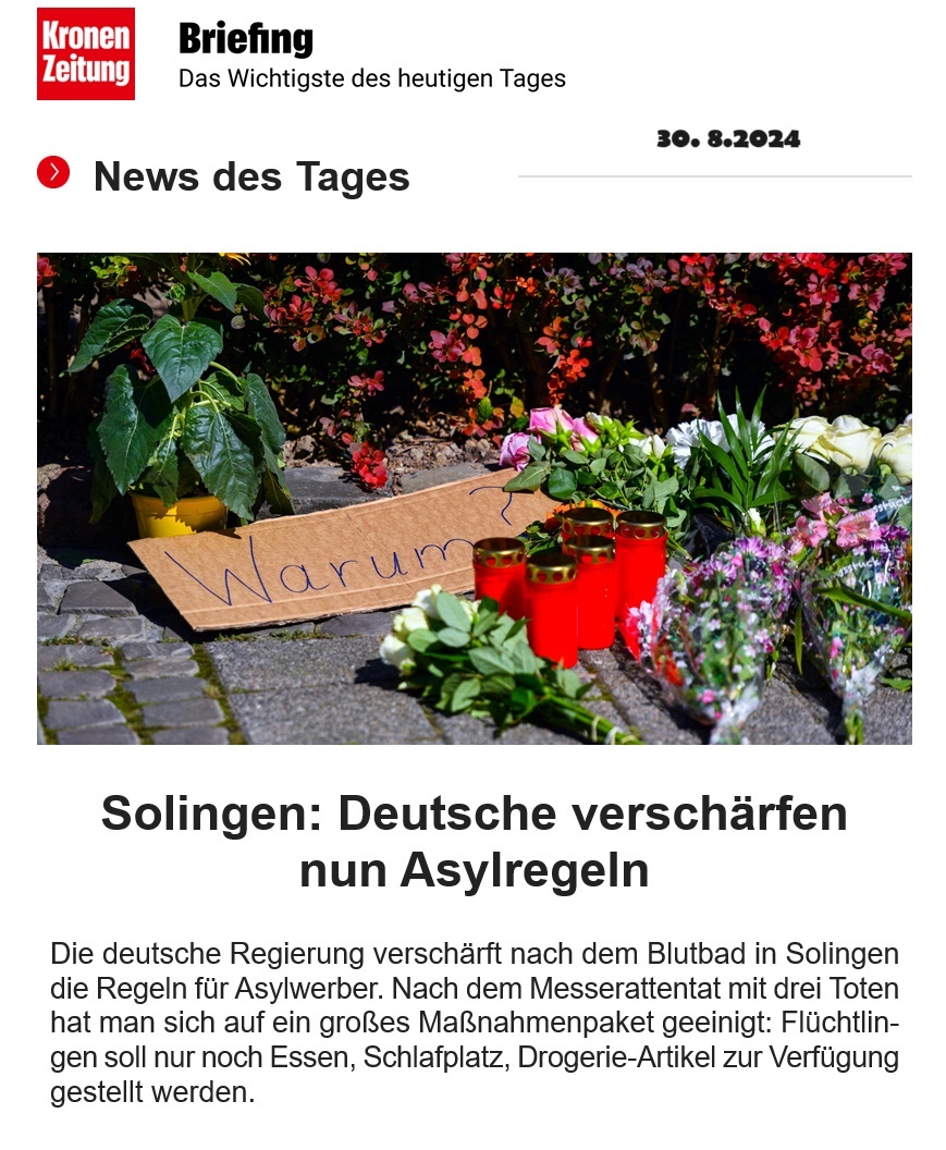 Nach einem furchtbaren Messerattentat in Solingen - in Verbindung mit denkbar schlechten Politik-Umfragewerten - denkt die deutsche Innenpolitik erstmals über eine geänderte Migrations/Asyl-Politik nach