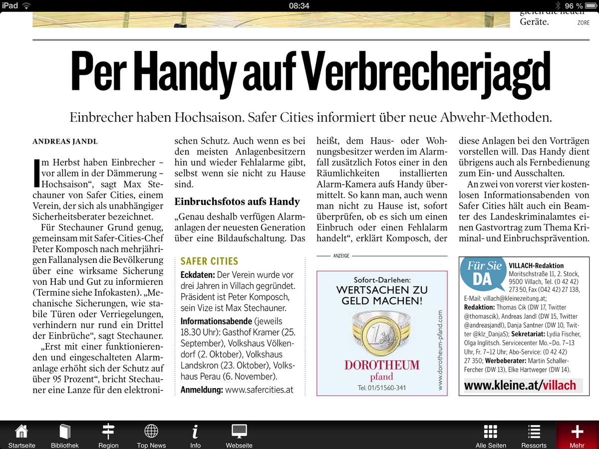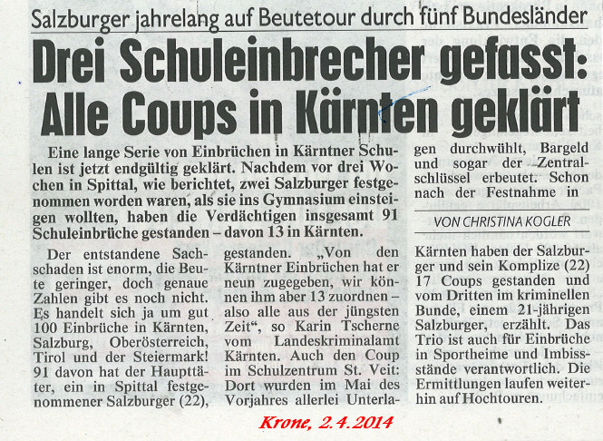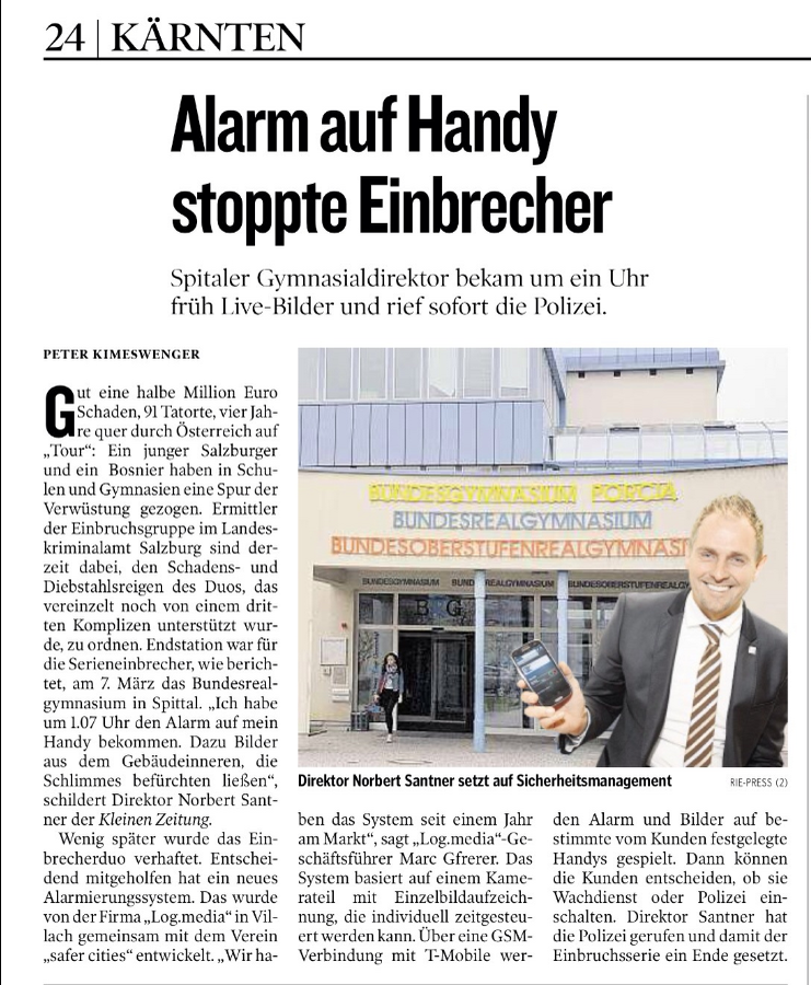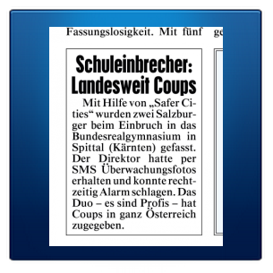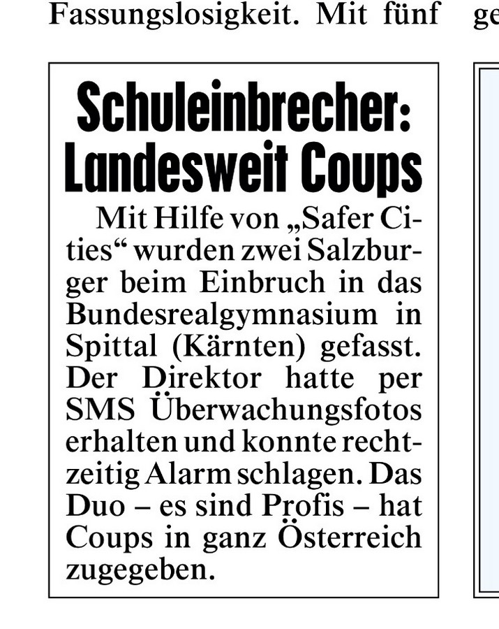 Das Alarmsystem EULE entdeckt ein Einbrecherduo im BRG Spittal und verständigt den Schuldirektor. Dieser verständigt sofort die Polizei - die Täter werden verhaftet. Zeitungsartikel dazu: