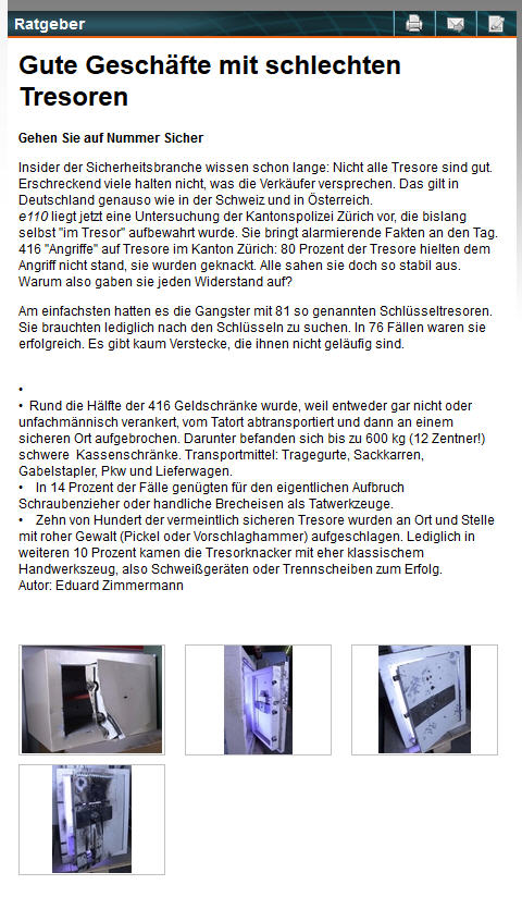 Eine Untersuchung der Kantonspolizei Zürich zeigt: 80 Prozent der Tresore hielten dem Angriff nicht stand (bei 416 Tresorangriffen). Davon konnten bei 81 Schlüsseltresoren in 76 Fällen die Schlüssel gefunden werden.