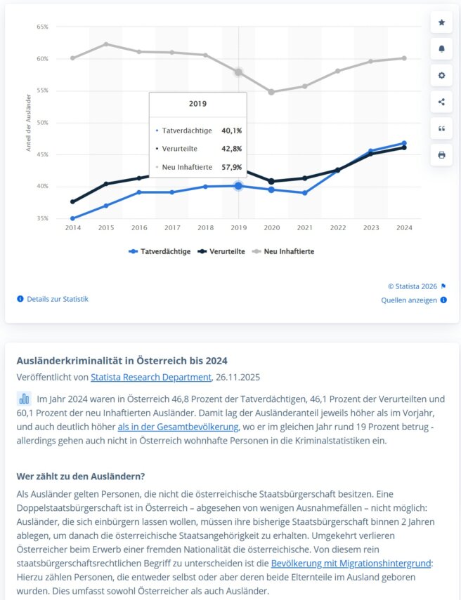 Eine seit 2015 ungehinderte und praktisch unkontrollierte aber organisierte Migrationsflut über Schlepper bringt eine enorme Belastung der österreichischen Ressourcen an der Spitze aller EU-Staaten mit sich - und gleichzeitig einen stetig steigenden Teil Krimineller ins Land. Abschiebungen bei kriminellen Handlungen sind noch der ganz ganz seltene Ausnahmefall - immerhin ändert sich die politische Meinung dazu 2025 und 2026 - zumindest einmal in Worten.
